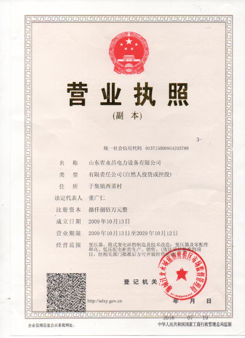 山东省永昌电力设备有限公司(永昌电力)国家电网电力变压器指定生产厂家,全国城乡电网建设与农网改造推荐企业,全国统一销售热线15806350882,15006359039,公司产品通过多年的挂网运行以“高能,低耗,低噪,价优”等特点荣获国家电力系统好评。节假日全国范围照常发货。联系人:马经理。公司专业生产s11型变压器,油浸式变压器,电力变压器,升压变压器,有载调压变压器,整流变压器,光伏变压器,有载调压变压器,耐高温变压器,矿用变压器,干式变压器等。并可按用户需求生产非标变压器,公司生产的各式变压器低耗节能、降噪环保、超低温升、超强负载、性能可靠、货真价实等优点,回报新老客户的支持与厚爱。
